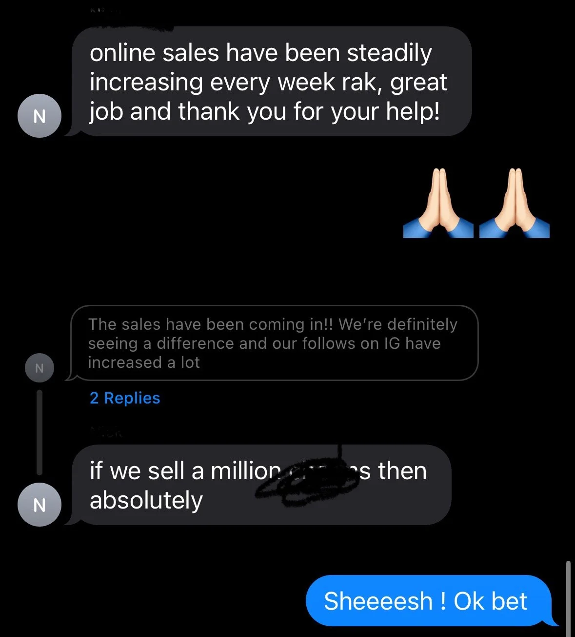 “Online sales have been steadily increasing every week. Great job and thank you for your help.”